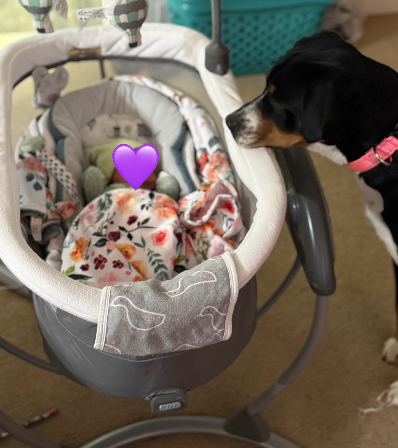 We are Two Paws Above and wanted to introduce ourselves! My name is Katherine and I have been happily married for 7 years to my sweet husband, Daniel. We have 4 beautiful children and 2 fur babies. We live in a small town in North Carolina and started entertaining the idea of breeding Greater Swiss Mountain Dogs 3 years ago. We chose Swissies due to how great they are with families, especially kids. They are energetic, gentle, affectionate, and playful; our kids can attest to that! Swissies form strong bonds and are very protective as you can see in the picture of our dog Leia looking over our youngest earlier this year.
